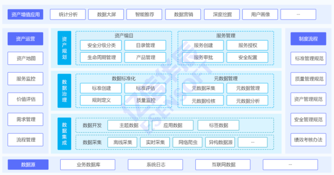 如图所示,遵循“全局意识、业务为本、数据为核、分步演进、局部执行”为原则,围绕“1+4+N”模式来建设和开展,助力数据资产管理项目敏捷建设和迭代升级。1个策略:保障数据资产管理职能落地实施;4大职能体系:以数据集成、数据治理、资产规划开发、资产运营四大管理职能为支撑;N项服务:服务N个数据增值应用和数字化应用场景。