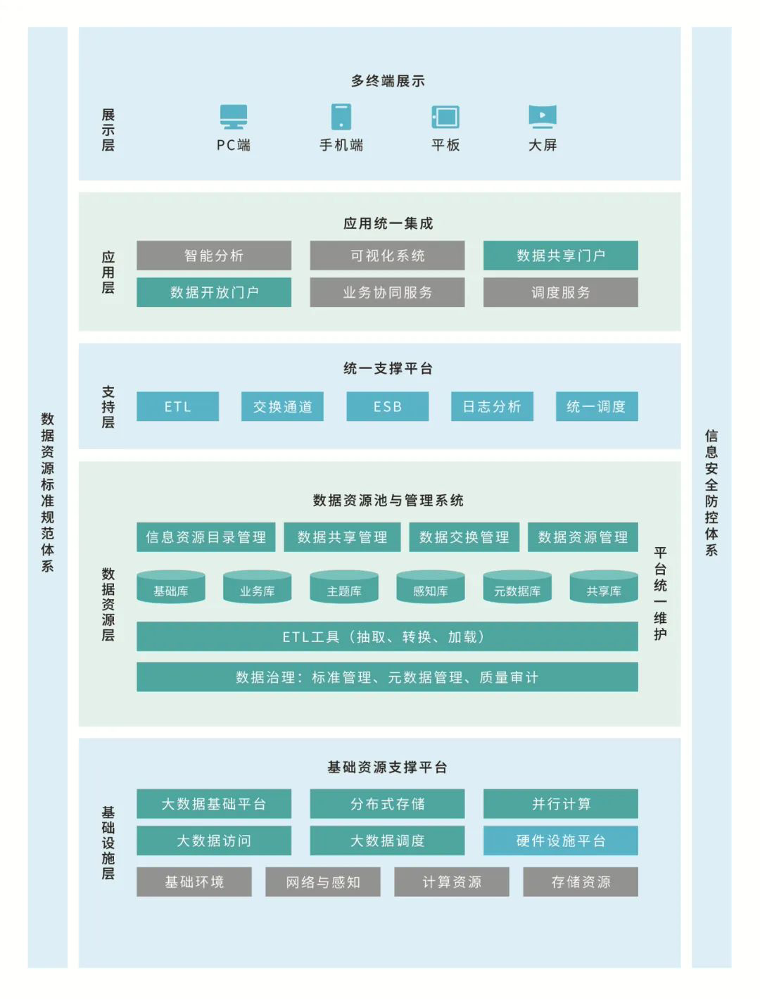 根据省级工程指南指导和该省交通运输行业的实际需求,亿信华辰支撑设计集团交通运输大数据资源管控平台的研发,主要包含基础设施、数据资源、支撑平台、应用、展示5层框架。如下图所示,其中绿色部分为核心研发内容。