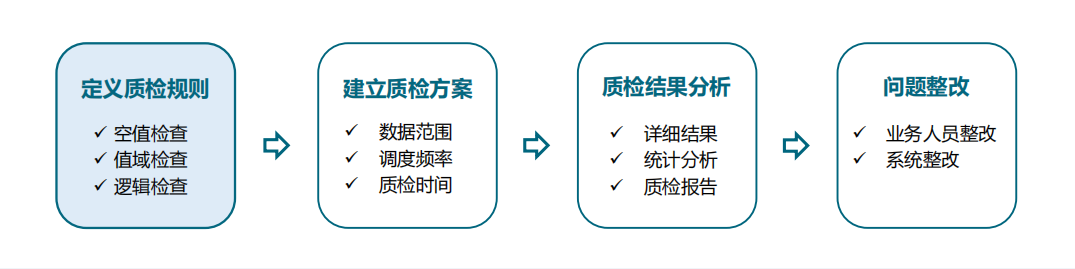 完成从定义质检规则、到建立质检方案、到质检结果分析、再到问题整改的数据质量管理全流程搭建测试,全流程全方位保障数据质量。