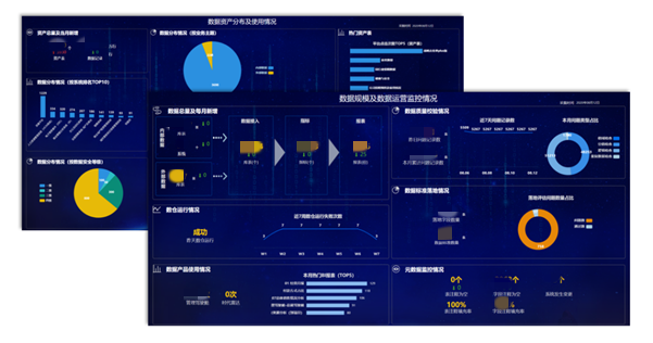 建立可视化大屏,将枯燥无味的数据转化成更加通俗易懂的图形语言,帮助人们理解和消化,让企业数据资产全景展现更直观。其中,数据资产分布大屏面向管理层,可直观清晰地展现资产分布情况及数据现状;数据规模及运营监控大屏面向数据管理人员,让数据在各模块的运行情况一目了然,实现他们对数仓运行情况及时监控。