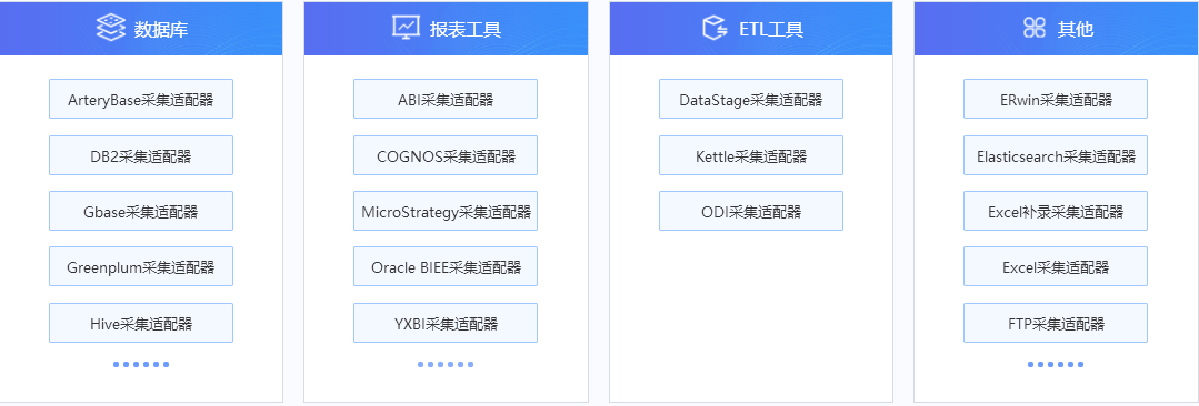 亿信华辰元数据管理平台EsPowerMeta是基于B/S架构的软件平台,架构分为5层,数据源层、采集层、数据层、功能层和访问层,其不仅适配各种数据库、各类ETL、各类数据仓库和报表产品,还适配各类结构化或半结构化数据源。