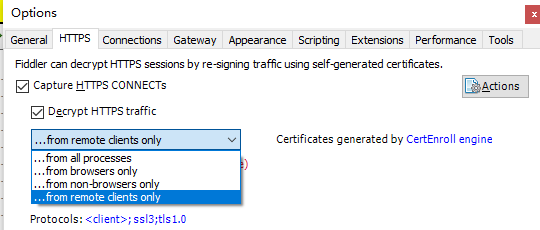 进"Tools"—>Options——>https项,选择"from remote clients only",就只显示抓到的手机上的数据包