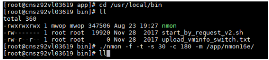 1) linux服务器终端,首先进入环境变量目录,使用命令记录一段时间内的监控数据,执行测试命令: