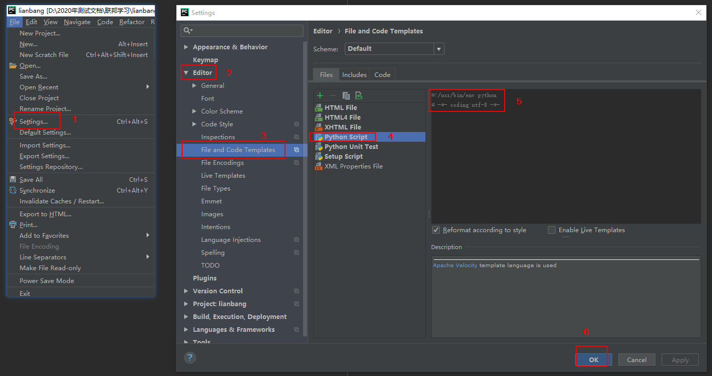 打开file->settings->Editor->file and code template->python script