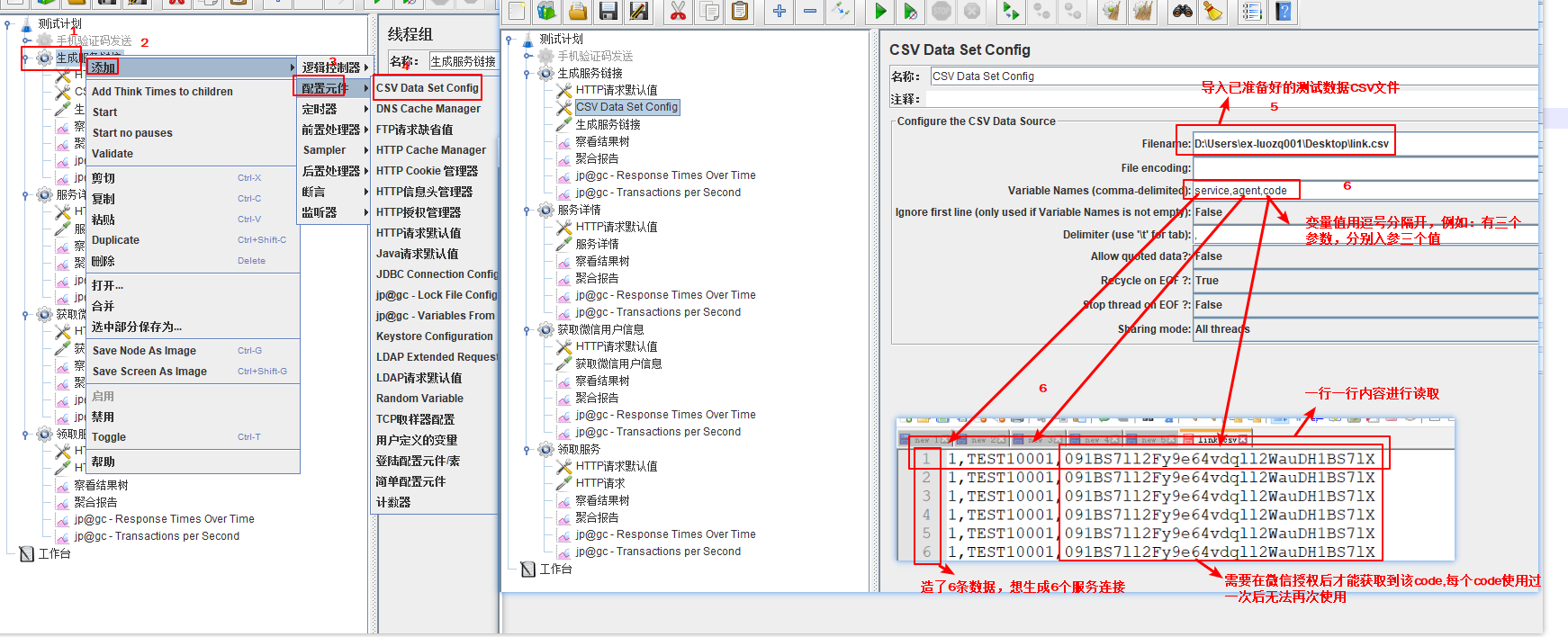 1、添加CSV Data Set Config -->测试计划右键-->THreads(Users)-->线程组-->右键添加-->配置元件-->CSV Data Set Config-->在Vaviable Names中输入变量-->在csv造好测试数据(每个变量值用逗号隔开,按顺序读取csv,列入下图,service读取csv第一行一个值,一行一行读取)-->最后在Filename中导入csv文件即可
