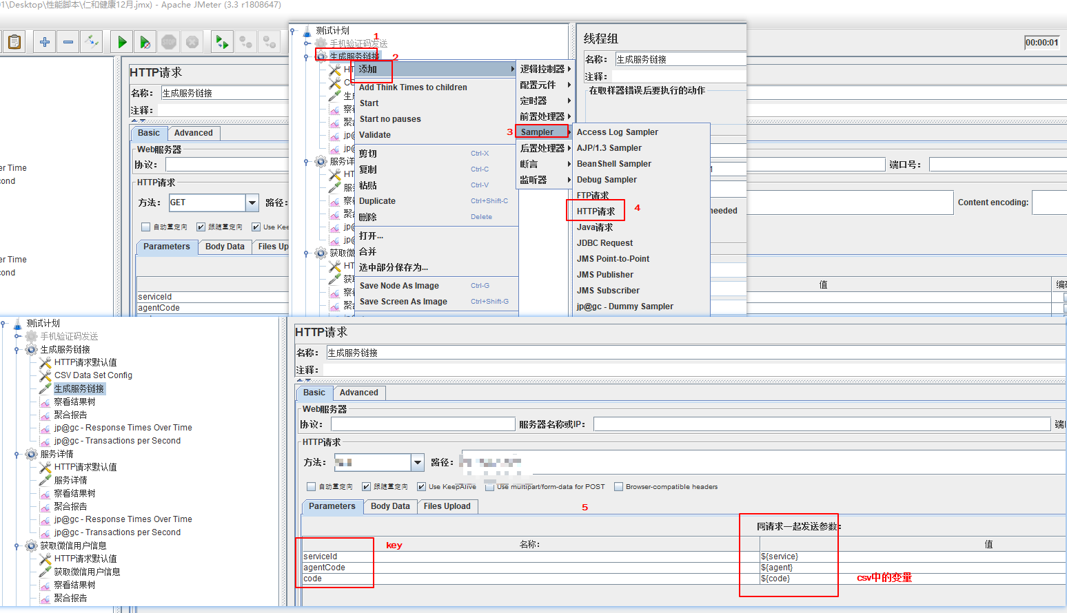 2、如何引用csv变量值 -->测试计划右键-->THreads(Users)-->线程组-->右键添加-->Sampler-->HTTP请求-->在Vaviable Names中输入变量