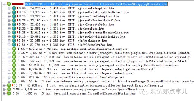 按调用时间算的百分比,最高的是WrappingRunable下面有10个百分比较高的http,这10个http就是本次压测的接口。每个接口的占用比都差不多,展开第一个9%的