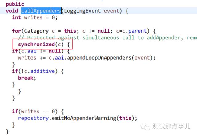 从这边可以看到在转发loggingEvent到各个appender的时候,是同步的,即使你用asycAppender也没有效果,解决方法使用logback,再压测一把,平均4k+,可以接受
