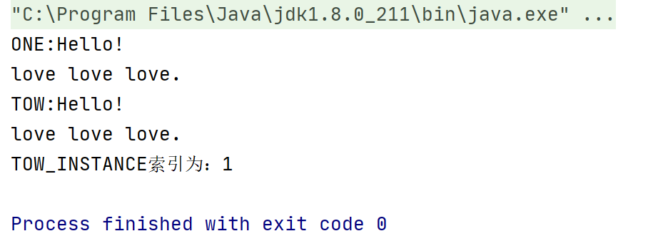 public enum LeaningEnum { //枚举里面的实例就是一个个对象,不过它们的属性都在外面。 ONE_INSTANCE{ @Override void sayHello() { System.out.println("ONE:Hello!"); } }, TOW_INSTANCE(2,"三蹦子"){ @Override void sayHello() { System.out.println("TOW:Hello!"); } }; int id; String name; //构造器默认private,也只能是private。 LeaningEnum(int id, String name) { this.id = id; this.name = name; } LeaningEnum() { } //抽象方法:类的每个实例都必须实现它。 abstract void sayHello(); //具体方法 void sayLove(){ System.out.println("love love love."); } public static void main(String[] args) { //返回枚举类中所有的常量(单例对象)。 LeaningEnum[] enums=LeaningEnum.values(); for(LeaningEnum temp:enums){ temp.sayHello(); temp.sayLove(); } //获取指定字符串值的枚举常量。 LeaningEnum temp = valueOf("TOW_INSTANCE"); //获取索引。 System.out.println(temp+"索引为:"+temp.ordinal()); } }
