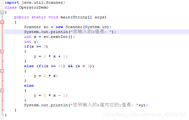键盘录入x的值,计算出y的值,y和x的关系满足: