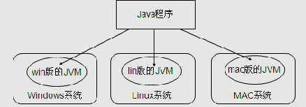 - 跨平台:跨操作系统(只需要在Java应用程序的操作系统上先安装一个Java虚拟机【java Virtual Machine】,由JVM负责Java程序在该系统上的运行)