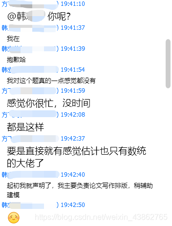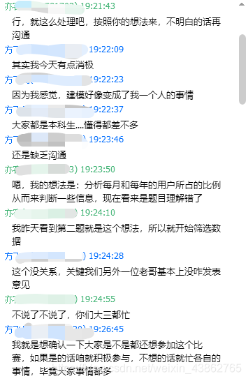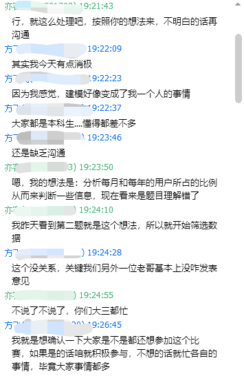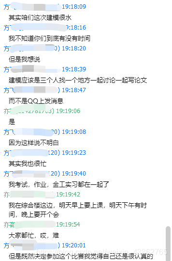嗯,大致聊天记录就是这样,在建模的第二天,大家内部出现了矛盾,方学长认为只有自己干活,其实我觉得吧,学长就是把第一问和第二问的思路大致说了一下,第一问是一个类似的概述题,第二问要编程解决,学长提供了思路,具体的还没开始。