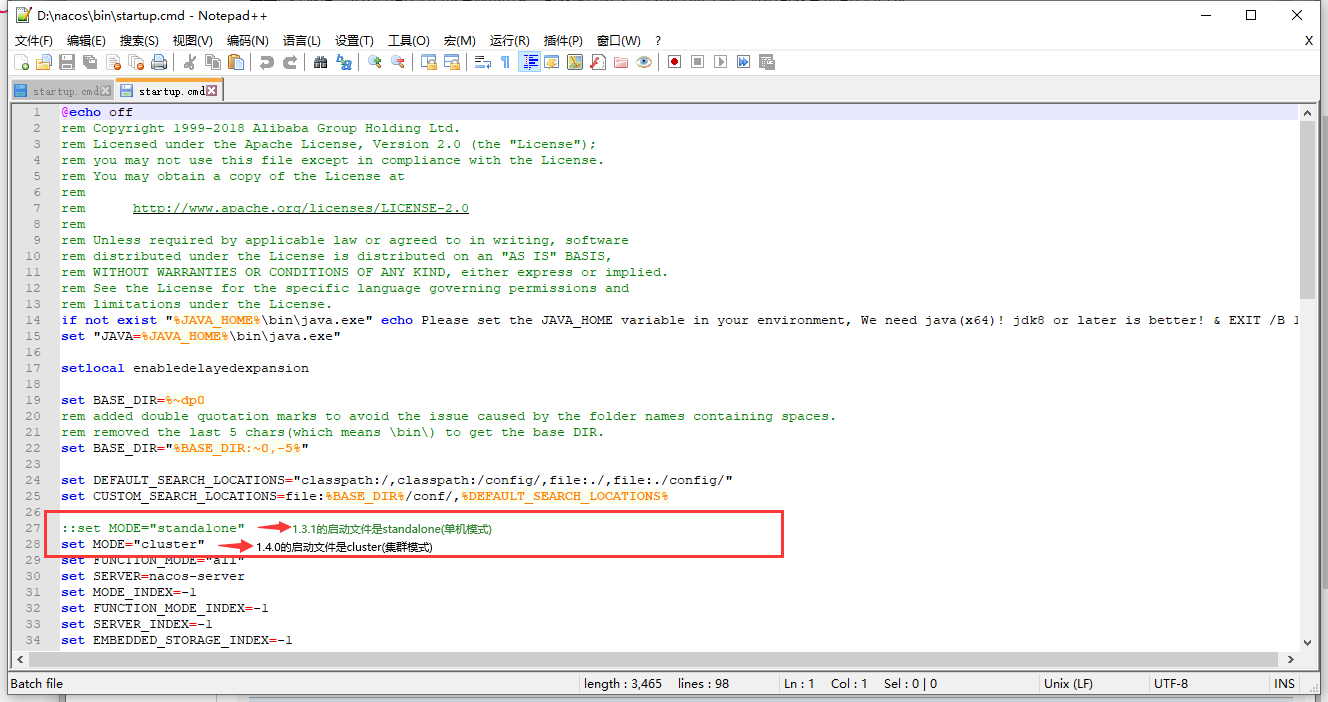 启动命令1.3.1版本可以不带参数启动.\startup.cmd,而1.4.0需要带参数启动.\startup.cmd -m standalone,原因如下: