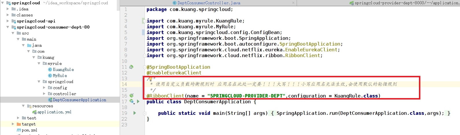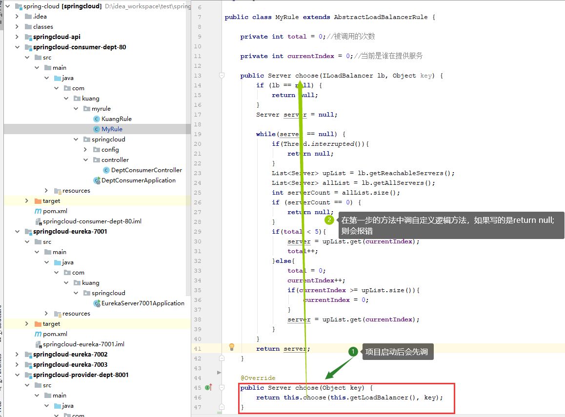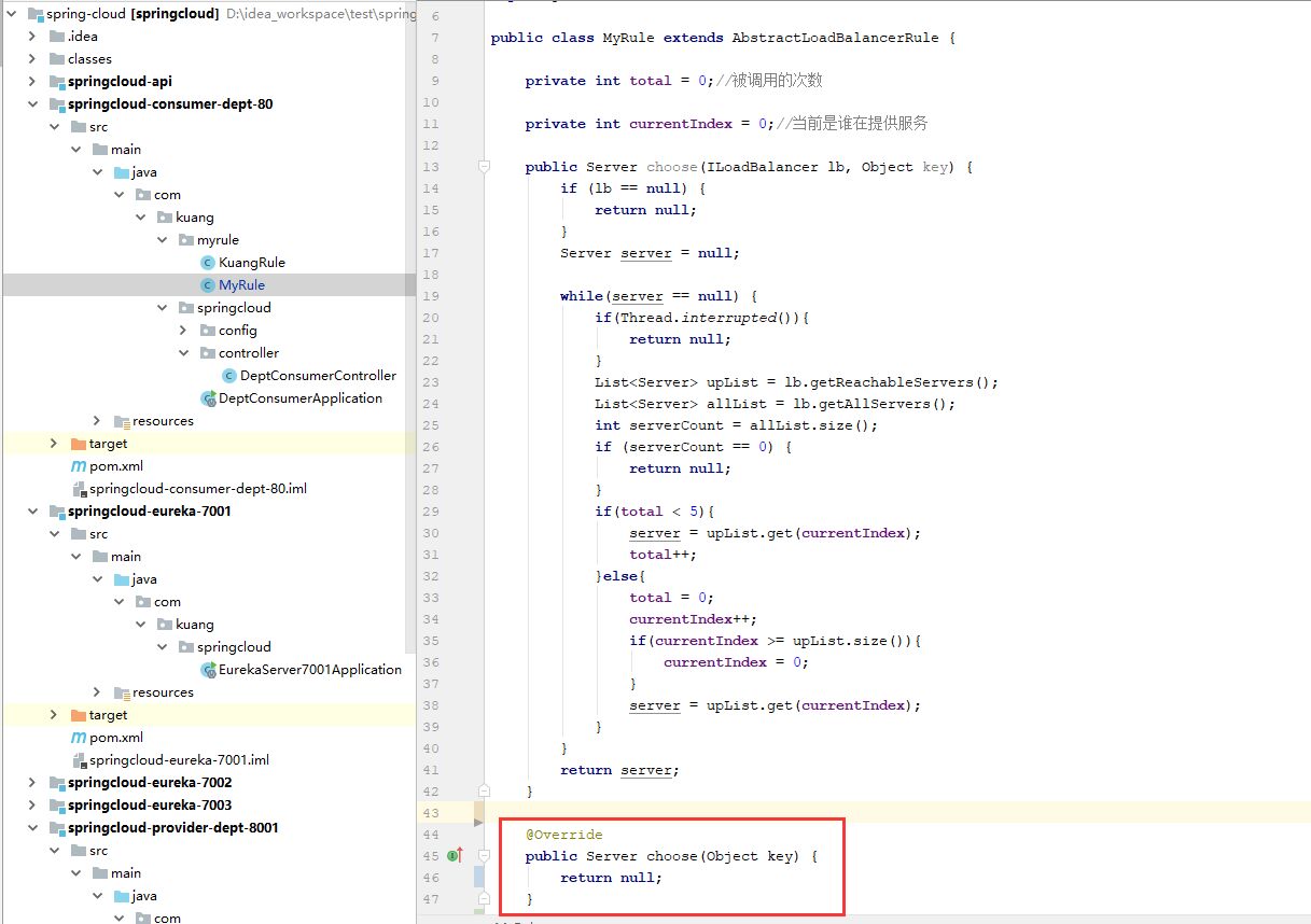 如果修改后没反应,请尝试依次重启所有服务并稍微等待,因为eureka有时会反应较慢。自定义规则时可打开 IRule 的实现类,如RandomRule,然后复制里面的内容