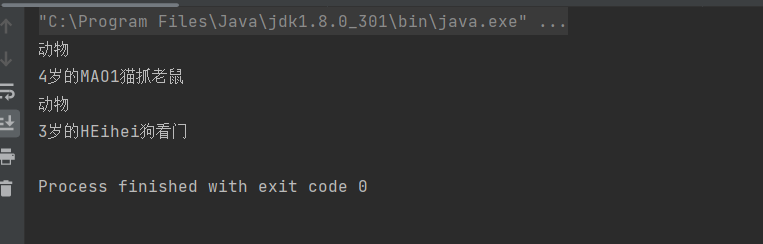 package Animals; public class Demo { public static void main(String[] args) { Cat c1 = new Cat(); c1.setName("MAO1"); c1.setAge("4"); System.out.print(c1.getAge() + "岁的" + c1.getName()); c1.CATDO(); Dog d1 = new Dog(); d1.setAge("3"); d1.setName("HEihei"); System.out.print(d1.getAge() + "岁的" + d1.getName()); d1.DogDo(); } }
