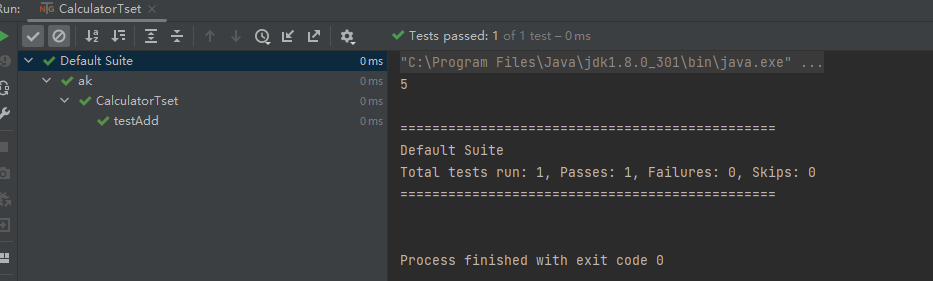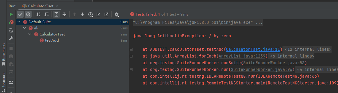 package ADDTEST; import org.testng.annotations.Test; public class CalculatorTset { /** * 测试add方法 */ @Test public void testAdd(){ Calculator c = new Calculator(); //int ab = 3/0 ;测试失败 int res = c.add(2,3) ; System.out.println(res); } }