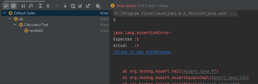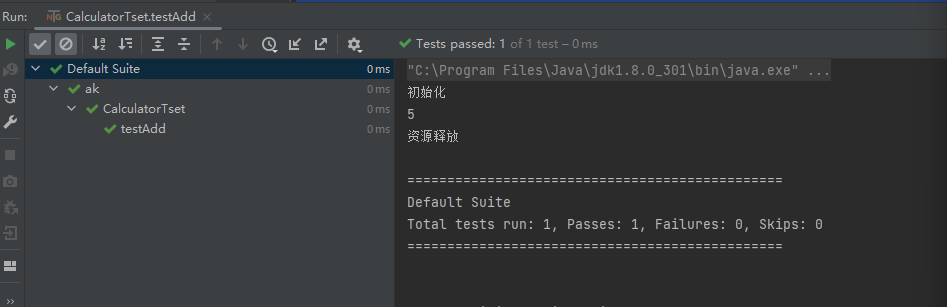 package ADDTEST; import org.testng.Assert; import org.testng.annotations.AfterTest; import org.testng.annotations.BeforeTest; import org.testng.annotations.Test; public class CalculatorTset { /** * 初始化 */ @BeforeTest public void init(){ System.out.println("初始化");//在Test之前执行 } /** * 测试add方法 */ @Test public void testAdd(){ Calculator c = new Calculator(); //int ab = 3/0 ;//测试失败 int res = c.add(2,3) ; System.out.println(res); Assert.assertEquals(res,5);//期望的值与真实值 } /** * 资源释放 */ @AfterTest public void close(){ System.out.println("资源释放");//即使测试失败也会释放资源 } }