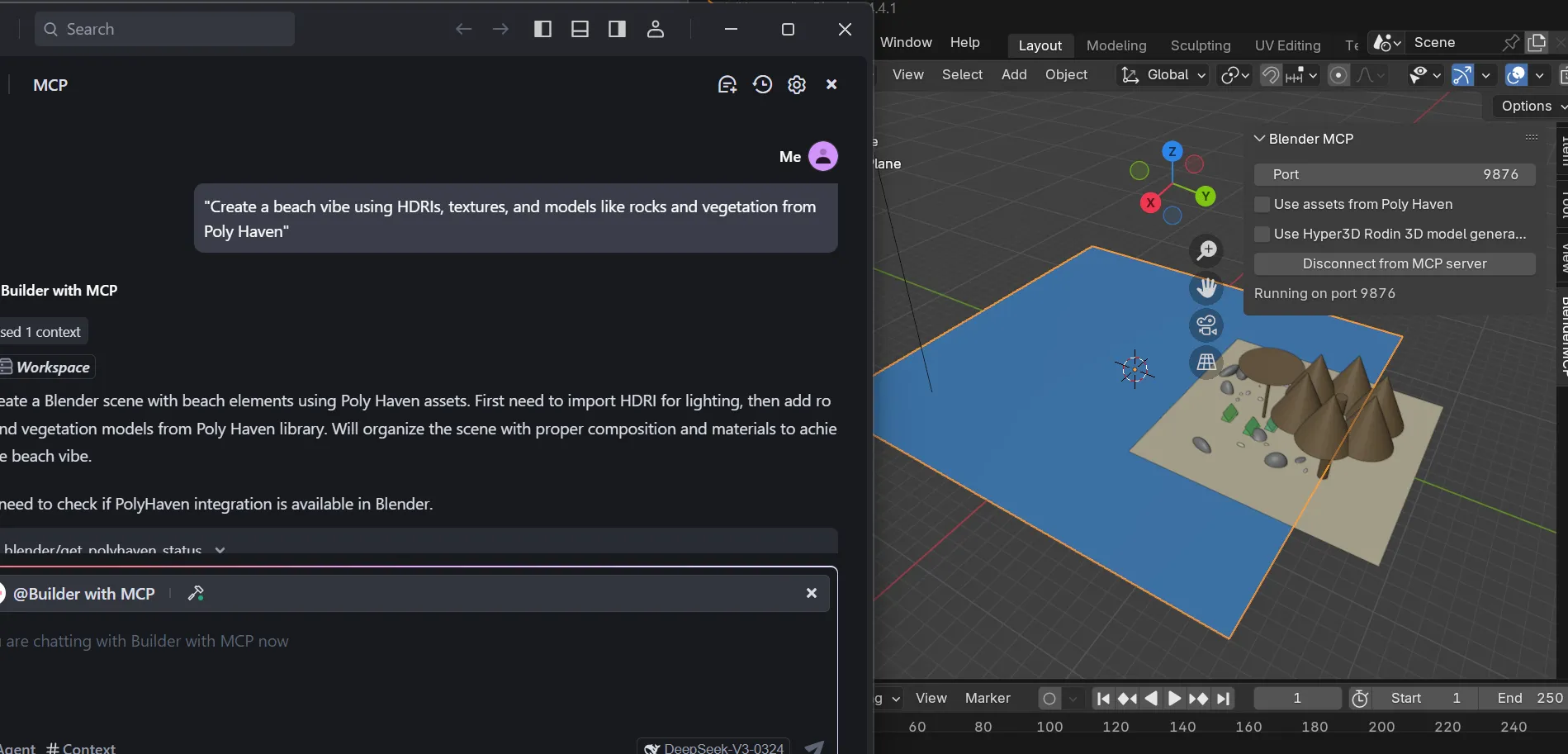 - 连接建立:当Blender中的Blender MCP插件完成程序和端口启动后,Trae上的Blender MCP插件即可与Blender建立连接。