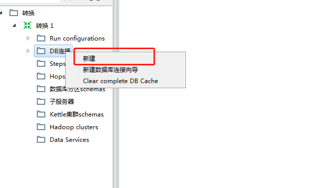 新建转换后在左边的主对象树中建立DB连接用以连接数据库。如图所示: