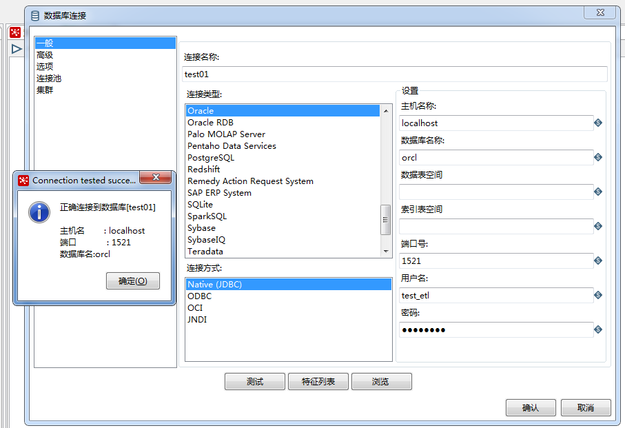 输入所要连接数据库的信息,点击测试看是否正确连接