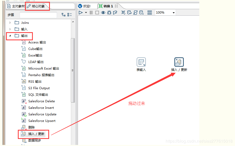 1.在左边面板中选择:核心对象à输出->插入\更新 如图所示: