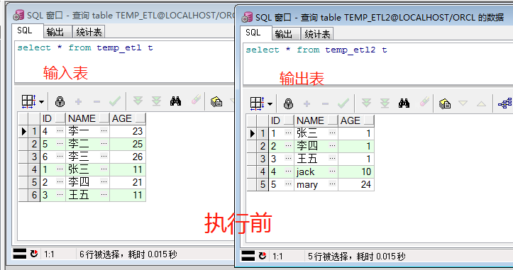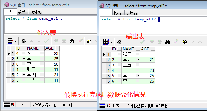 可以看到,输出表ID为1,2,3的age字段数据数据进行了更新,ID为4,5的name,age字段数据进行了更新,id为6的数据进行了插入