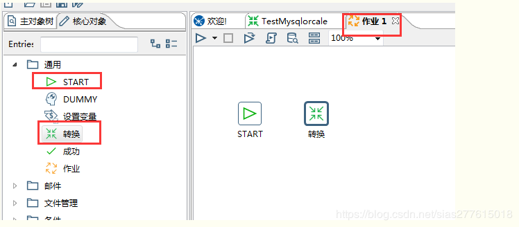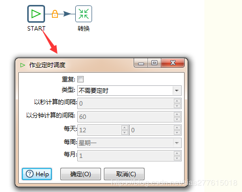使用作业可以定时或周期性的执行转换,新建一个作业。并从左边面板拖入start 和转换。