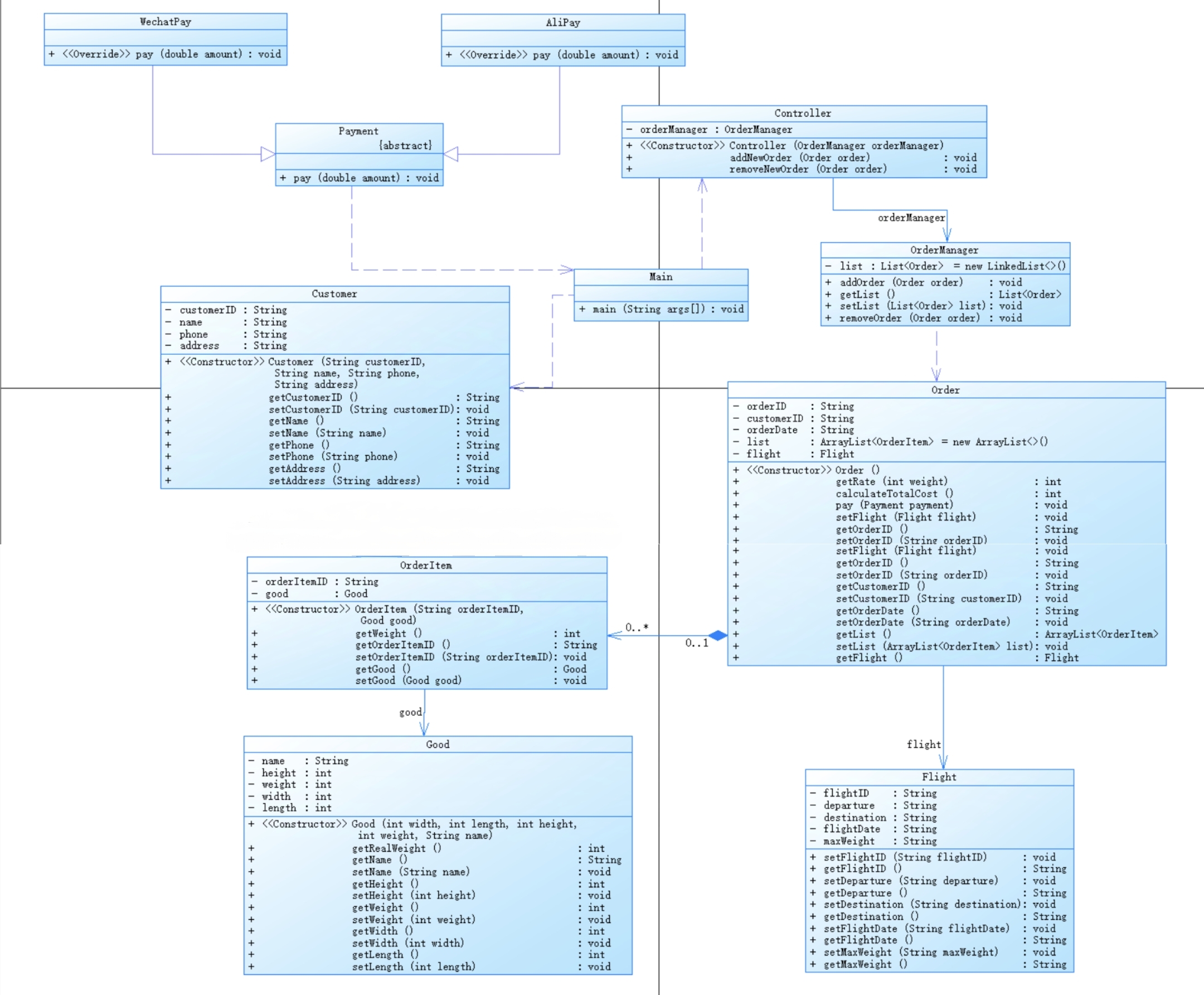 OrderItem类 Order类 Good类 Customer类 Flight类 Payment类 OrderManager类 Controller类