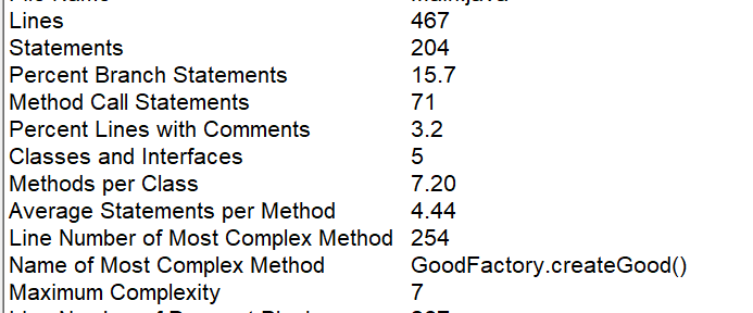 Line Number of Most Complex Method:最复杂方法的行号(254),定位到 GoodFactory.createGood() 方法。