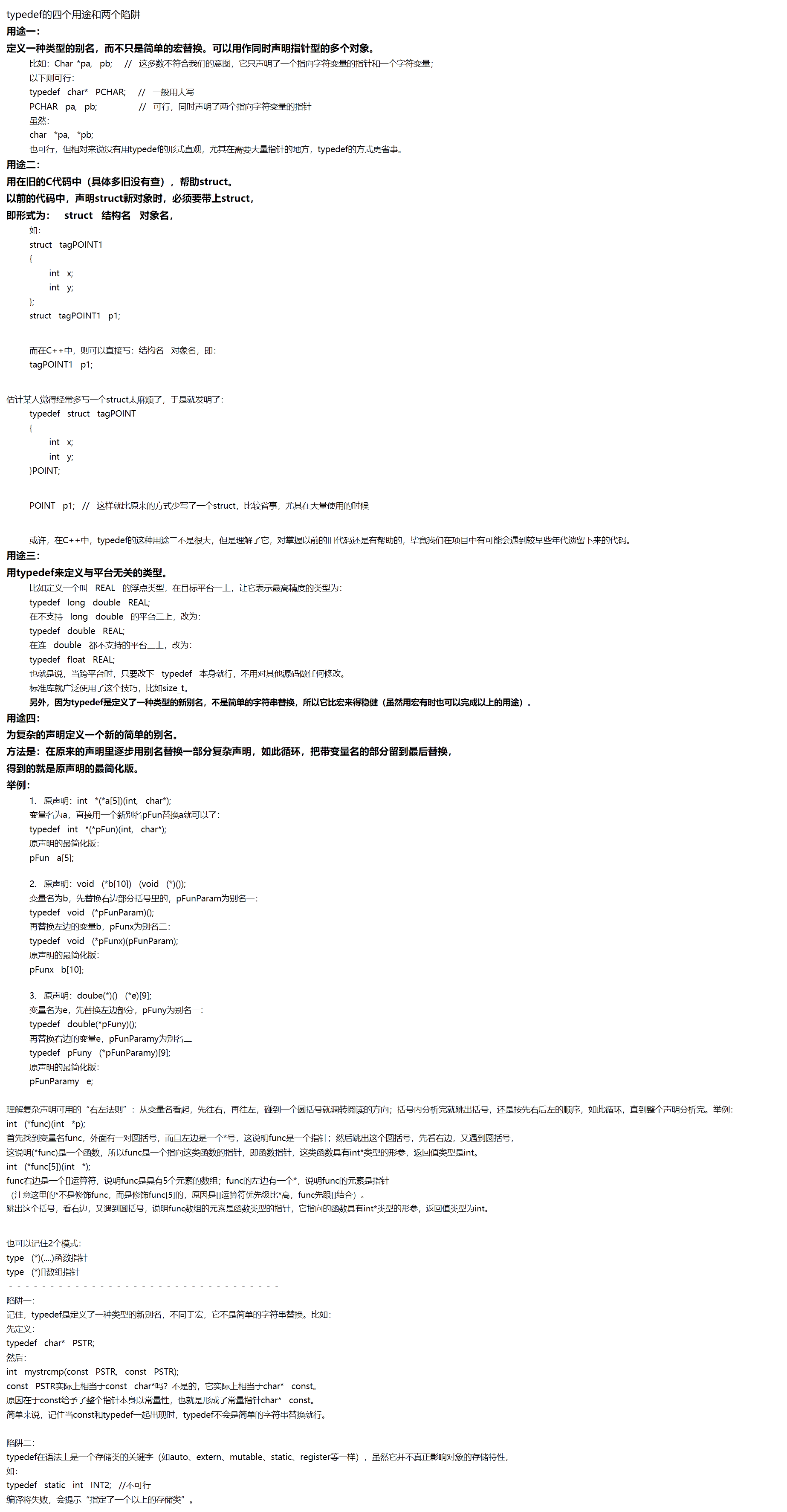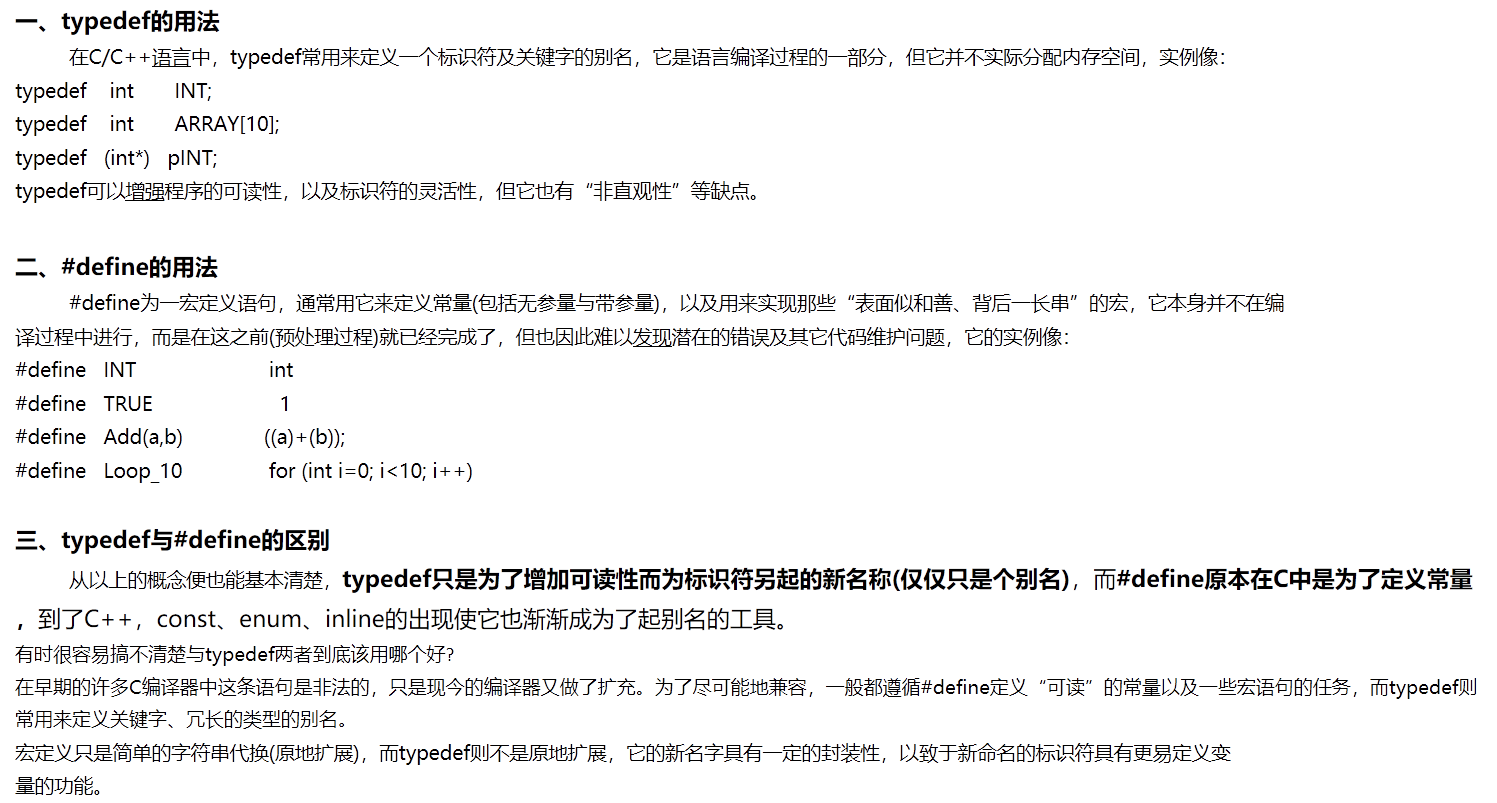 typedef常用来定义一个标识符及关键字的别名,它是语言编译过程的一部分,但它并不实际分配内存空间