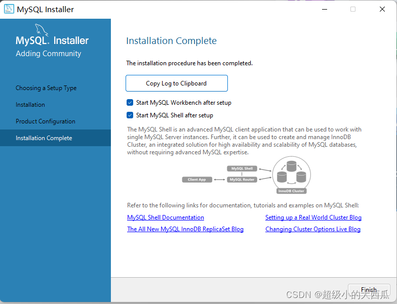 17.完成点击Finish(第一个是Mysql的客户端,如果不使用只勾选第2个“start mysql shell after setup”,点击“finish”)(到这里数据库的安装就完成了)