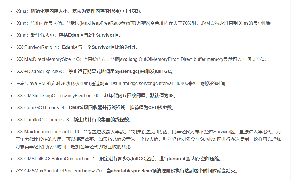 -Xms2048m // 设置jvm的初始内存。这个值最好设置的跟-Xmx相同,以避免每次垃圾回收完成后JVM都要重新分配内存 -Xmx2048m // JVM最大可用内存 -XX:PermSize=256M // 设置持久代大小 -XX:MaxPermSize=512M // 设置最大持久代大小 -XX:+PrintGCDetails -XX:+PrintGCDateStamps // 输出GC详情 -XX:+PrintGCApplicationStoppedTime // 打印垃圾回收系统暂停时间 -Xloggc:${CATALINA_BASE}/logs/gc.log // 输出gc日志 -XX:+HeapDumpOnOutOfMemoryError // JVM遇到内存溢出的时候会抓到一个堆转储快照,并保存到一个文件中 -XX:HeapDumpPath // 堆转储路径