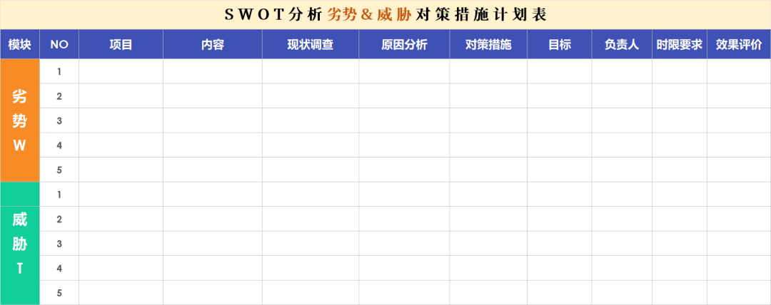 2.威胁和劣势的原因和对策:结合公司具体情况,对威胁与劣势进行充分的评估和判断,客观评价,将威胁降到最低,将劣势减到最小。