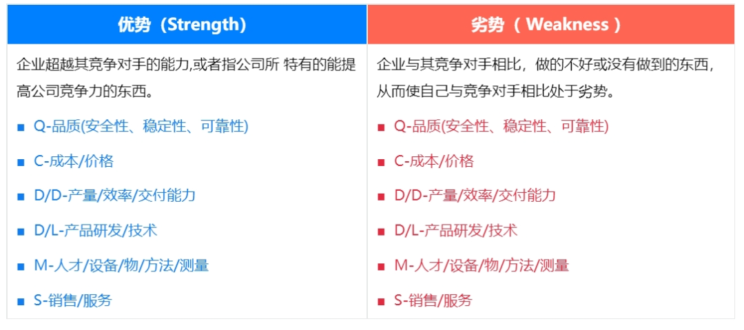 1.内部环境分析:内部环境分析主要是针对(Strength—优势)和(Weakness—劣势)的分析,结合企业管理目标的六大要素(Quality 、 Costing 、Delivery、 Morale 、Safety)进行分析: