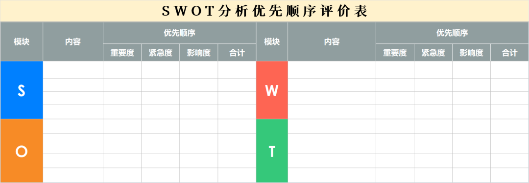 2.SWOT优先顺序评价方法:根据优先顺序评价规则,对S(优势)、W(劣势)、O(机会)、T(威胁)四个方面分别进行评价,根据紧急度、重要度、影响度三项得分之和排出优先顺序。