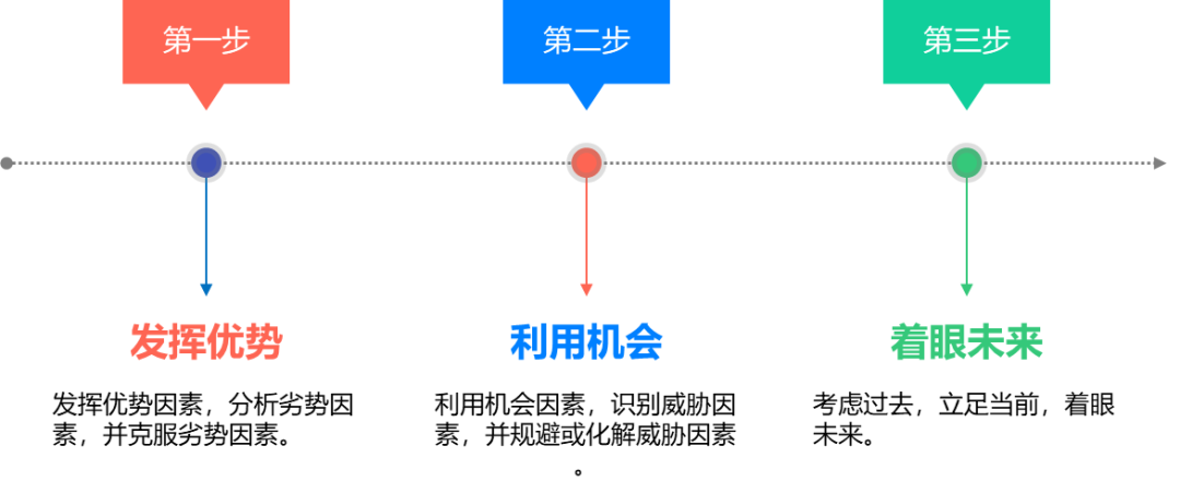 第一部分为SW,主要用来分析内部条件。分析我们的优势,人要有自知之明。例如:核心竞争力是什么?未来发展带给我们的信心,要做到心中要有数。我们的劣势是什么?还要清晰的知道,比如在研发技术方面、内部的薪酬激励,包括资金带来困境等等,这方面必须要实事求是。