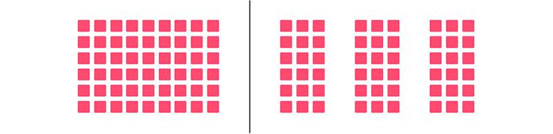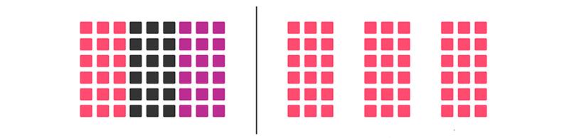 在这里我们用两种方式排列盒子,同样数量的方块,我们会觉得左边扎堆的一组,而另一边则是分散的三组;