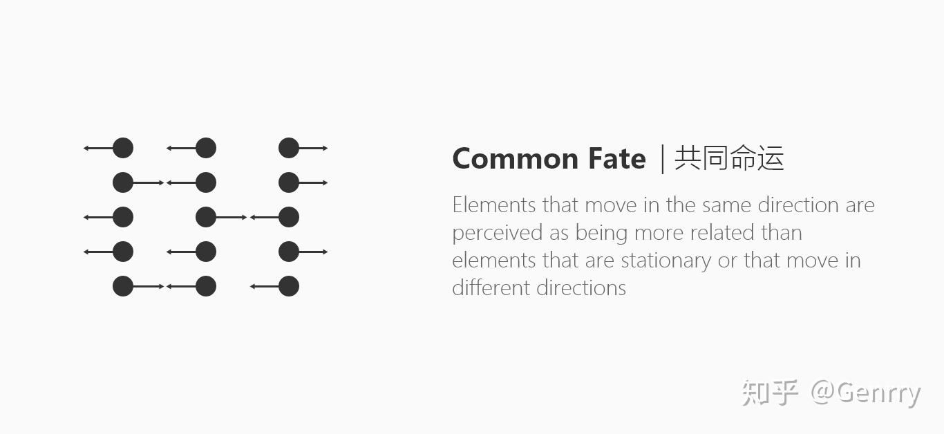这一原则运用在动效上居多,共同命运原则指出在整体的视觉条件下,某些物体,或是同时、同速、同方向往一个地方移动,这些个别物体会被视为一组,如下图中带有灰色箭头的