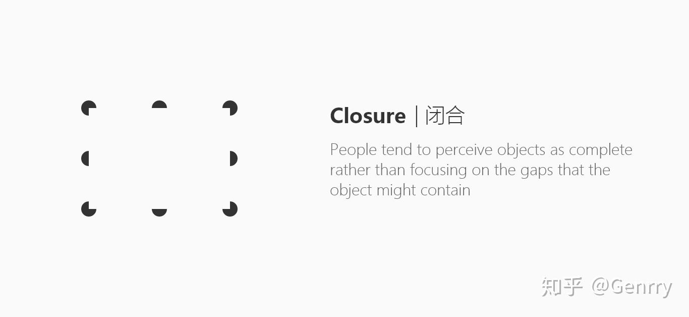 当我们在观看时,并不是一开始就区分某个单一的组成部分,而是将这些单一的组成元素组合起来使其成为一个易于理解的统一体。当看到某个部分是不完整的时候,我们的大脑会将不完整的信息按照已有的信息填补,并将其视为一个整体。