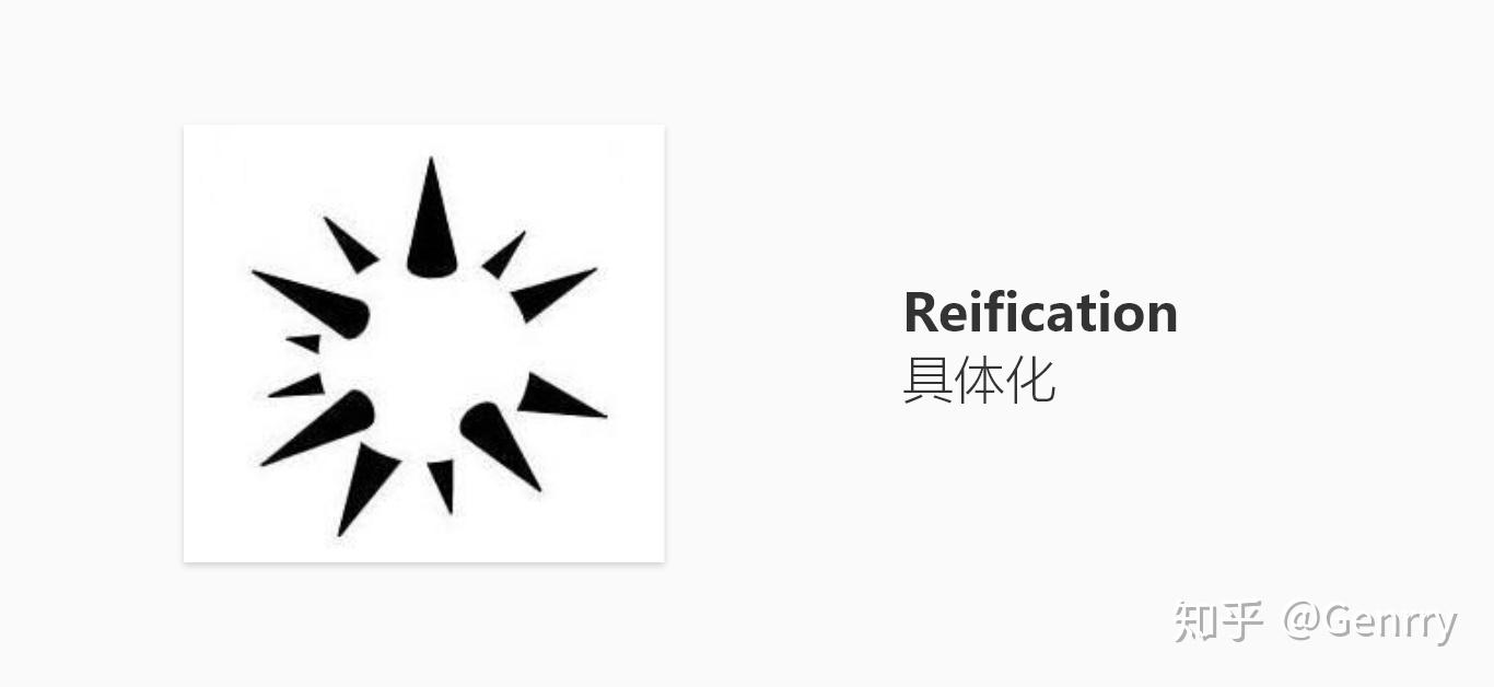 具体化是指大脑在视觉信息缺失时填补空白的能力。这个过程也赋予了不实际存在的抽象或视觉图像的意义。如上图,钉子似乎是从一个白色球里伸出来的。然而,如果你再看一次,它只是一系列的尖峰围绕着一个空白区域。由于黑色箭头的特殊排列及形状,我们的大脑会用一个不存在的白球填充空白。具体化是一种感知建构方式,被感知的物体包含着比实际存在物体更多的空间信息。