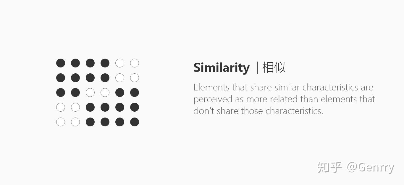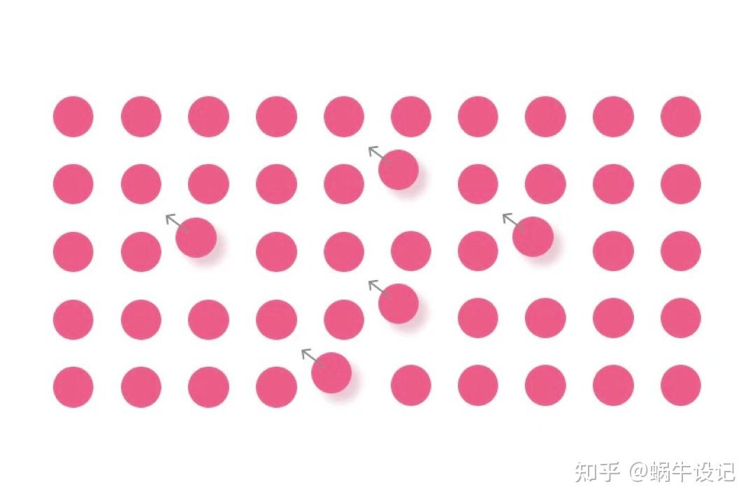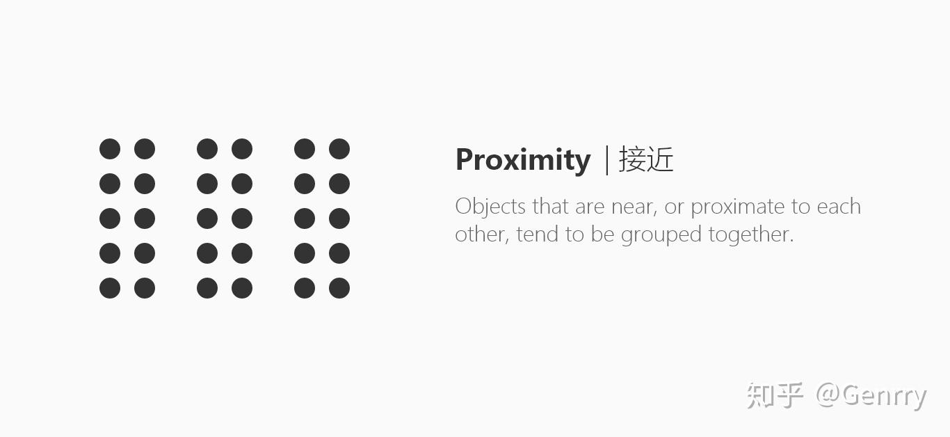 这里的接近性和我们所说亲密原则类似,当我们看到各种各样的物体时,通常会将彼此靠近的元素组织为一个组。也就是元素与元素之间的距离会影响我们是否将这个(这些)元素组织在一起以及怎样组织在一起,元素与元素之间距离越近的会被组织在一起,而那些距离相对较远的则自动划分在组外。看下图
