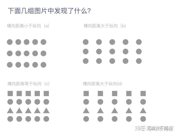 我们的大脑会自觉地将视觉上靠得近的物体看做一个组,而将靠得远的两个物体自动分离开来,通过这组示例图片,相信你会有比较清晰的理解;