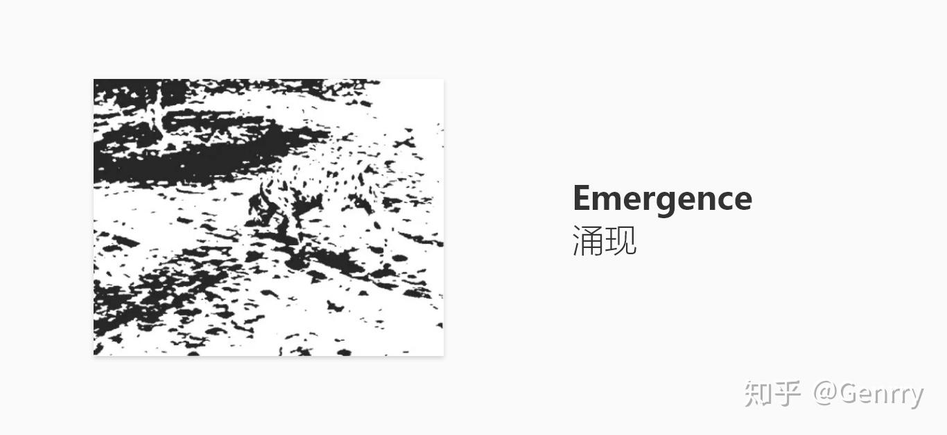 当一个实体被观察到有其自身各部分都不具备的特性时,称之为涌现。这些特性或行为只有当部分在更广泛的整体中相互作用时才会出现。一个典型的例子如上图,你能看到简单的斑点,但慢慢地会发现图中描绘着“一只斑点狗在树下嗅来嗅去”。我们的大脑会自动解析斑点的布局逻辑,与我们所已知的模式一一配对,直到让我们看到比原来更相关联的一组事物。