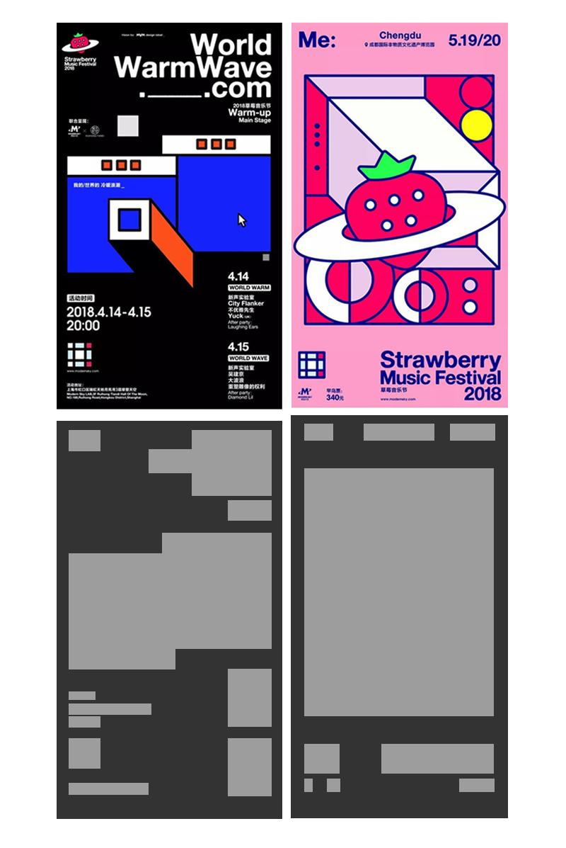 而在版式设计中,我们会将图文信息以不同形状,颜色,大小分组展示,这样在视觉层次上会有明显区分,也更易于阅读;比如在下面这组海报(2018年草莓音乐节),元素以组的形式分布在海报中的各个位置,形成不同大小的视觉层次,让我们能够依次看到主要信息、次要信息、辅助信息等内容,这也是设计者希望我们看到的信息顺序;