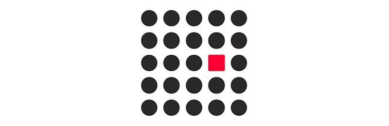 换个栗子,下图中,你第一个注意到一定是那个红色的方块,因为红色方块跟其他的元素明显不同。