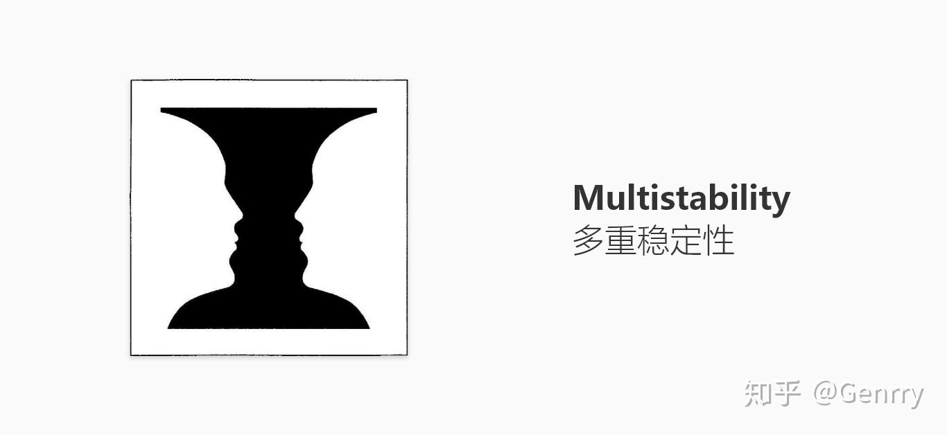 多重稳定性是指模糊的知觉经验在两种或多种不同的解释之间,不稳定地来回切换的倾向。因此,有些物体可以通过多种方式被感知。上面是一个熟悉的例子,图像可以被看作两个白色的侧脸或一个黑色的花瓶。但我们不能同时看到两者。相反,会在两个稳定的选择之间快速地来回跳转。一旦其中一种成为主导感知,就越难看到另一种感知。