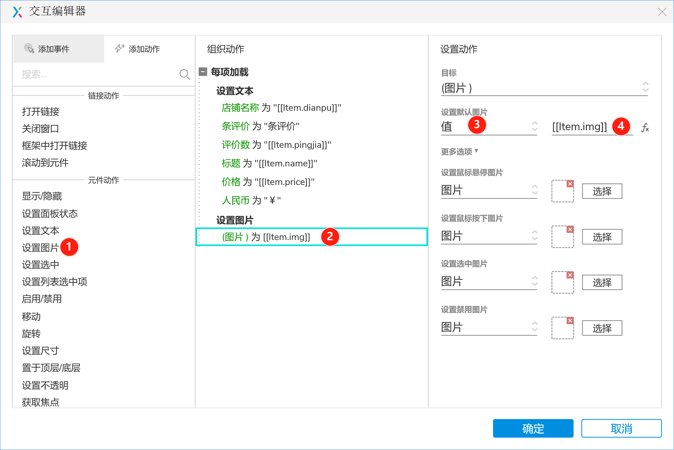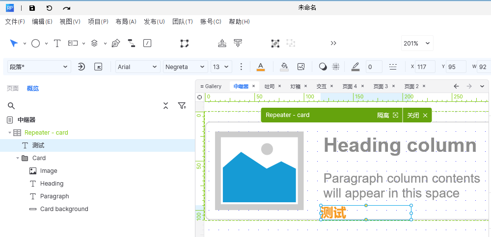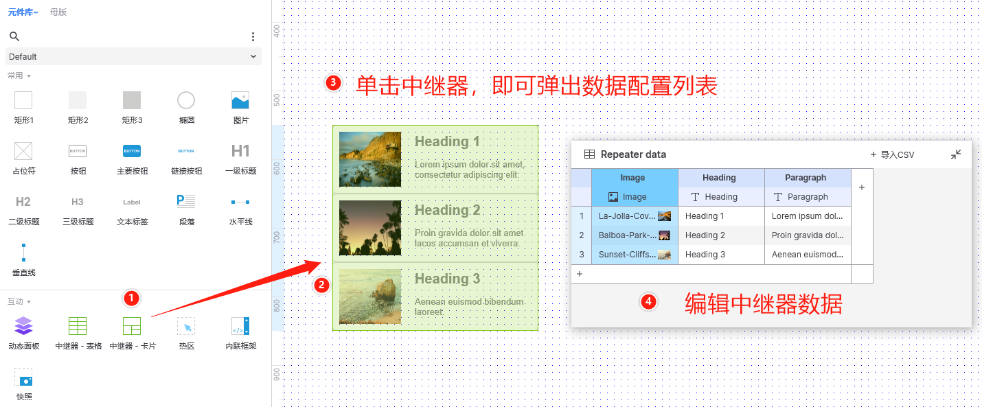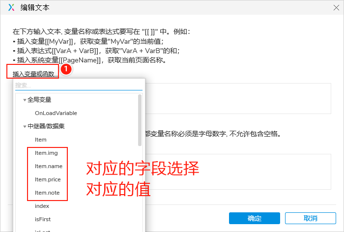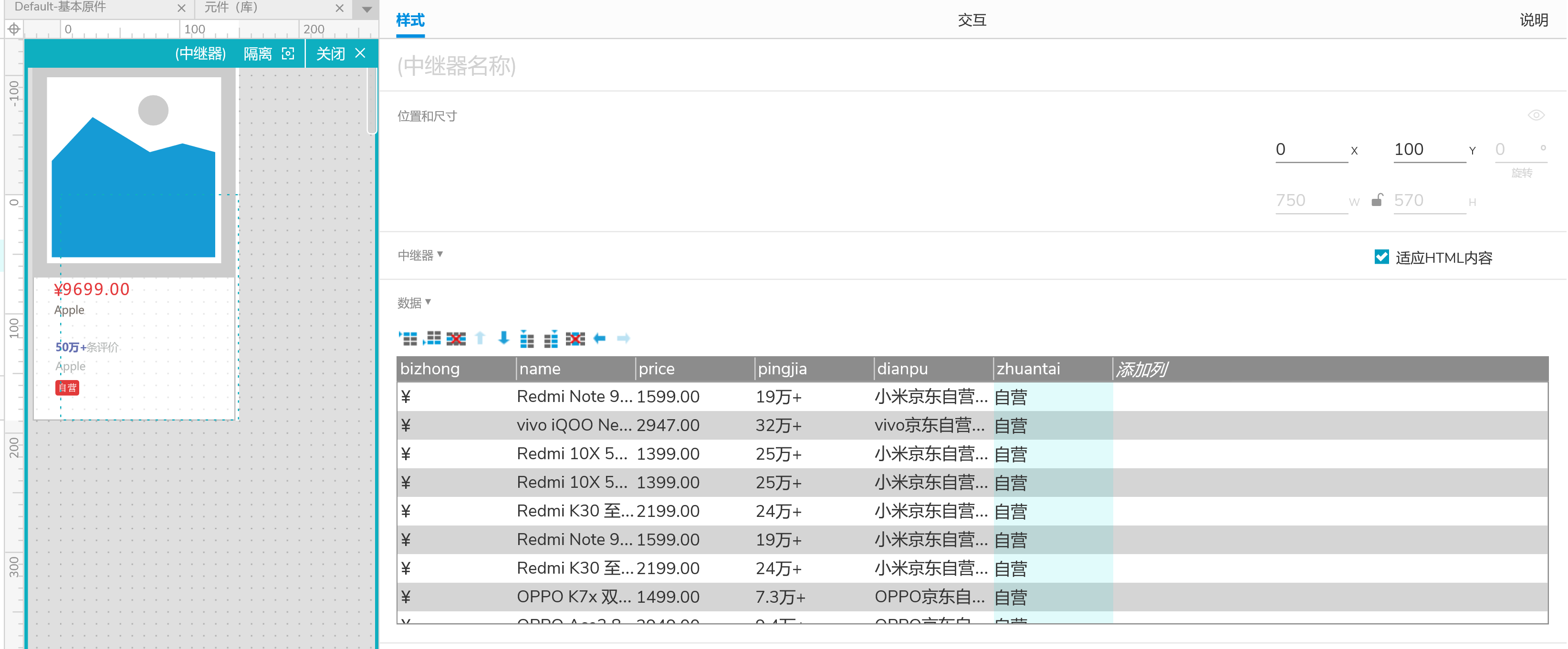 1.创建中继器,并将各个元素拆分成独立字段,并对每个元素进行命名: