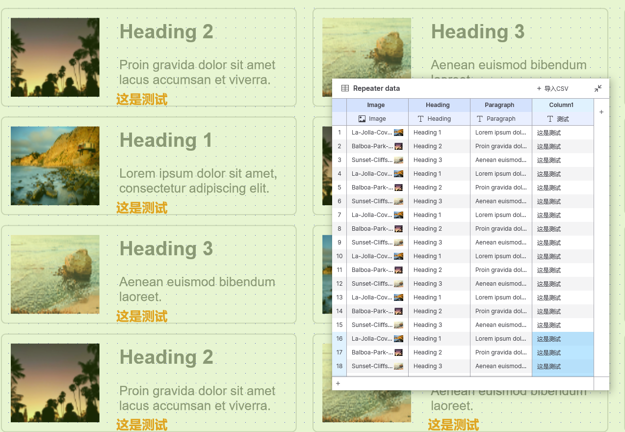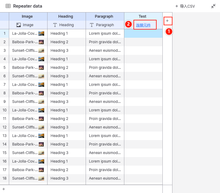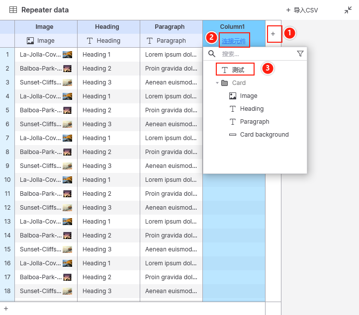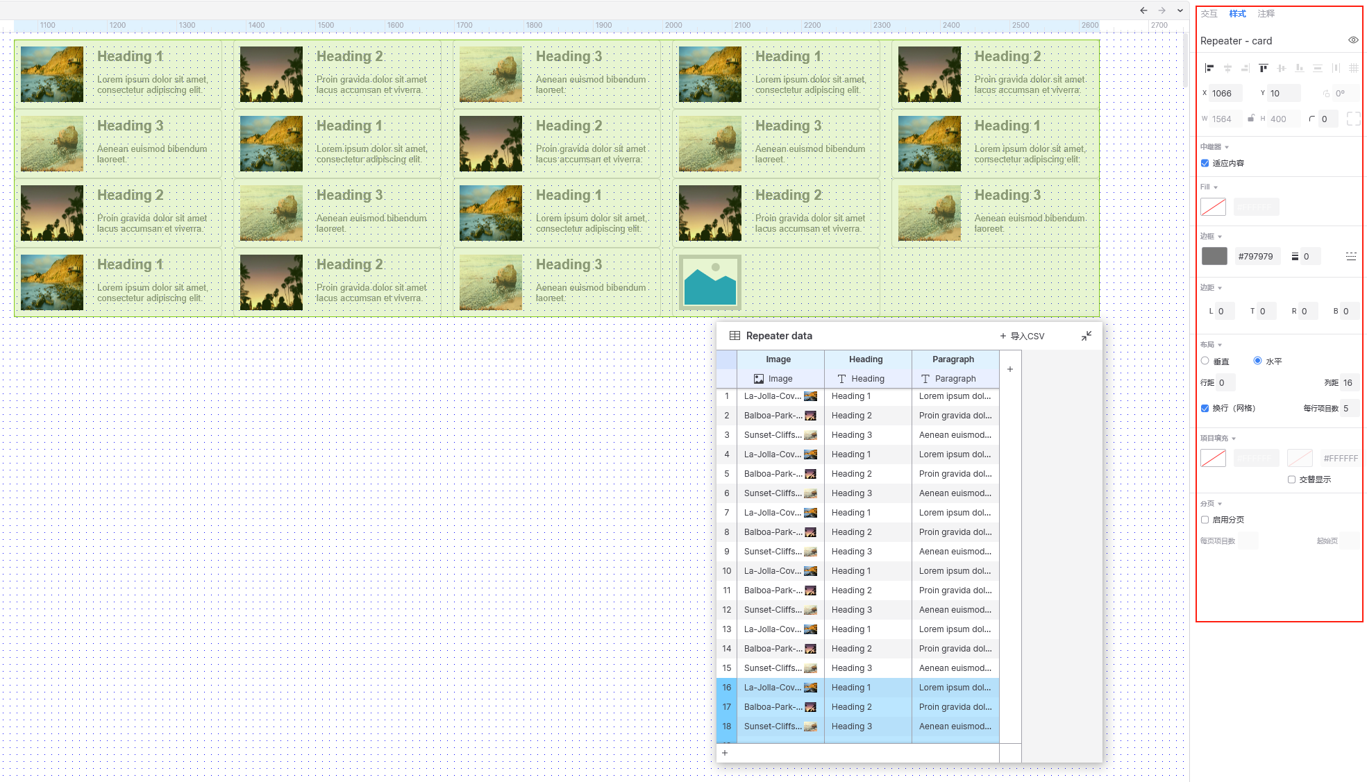 1.创建中继器,并将各个元素拆分成独立字段,并对每个元素进行命名: