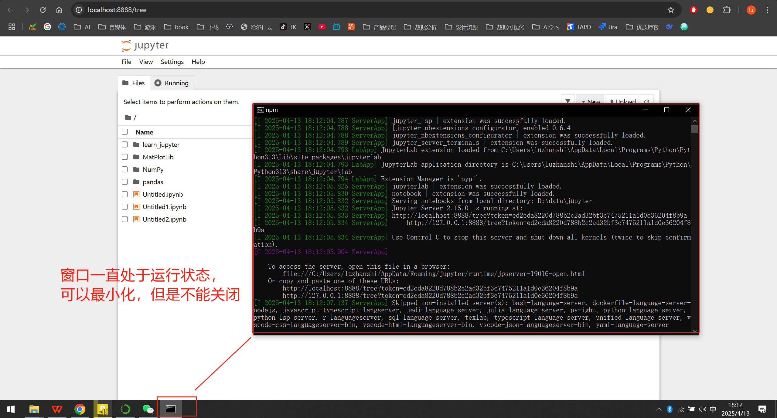 正常情况下,我们使用cmd启动jupyter之后,我们电脑的cmd窗口必须一直处于打开状态,因为关闭cmd窗口,jupyter服务就会停止: