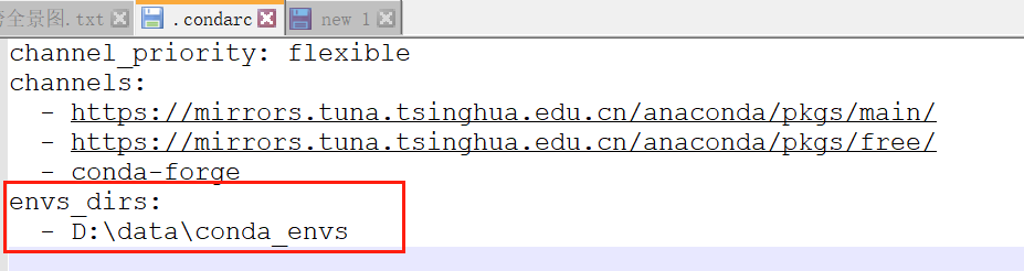 注意,如果要设置环境所在的路径,请在conda创建环境之前,在配置文件“.condarc”里添加:envs_dirs 属性: